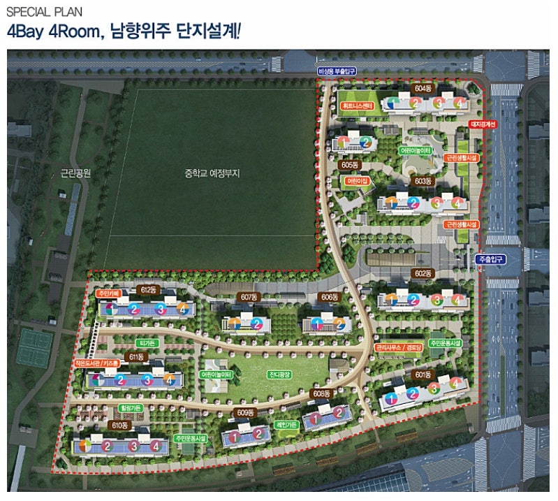 단지 중앙부 커뮤니티·녹지 배치 → 체감 쾌적도 높음